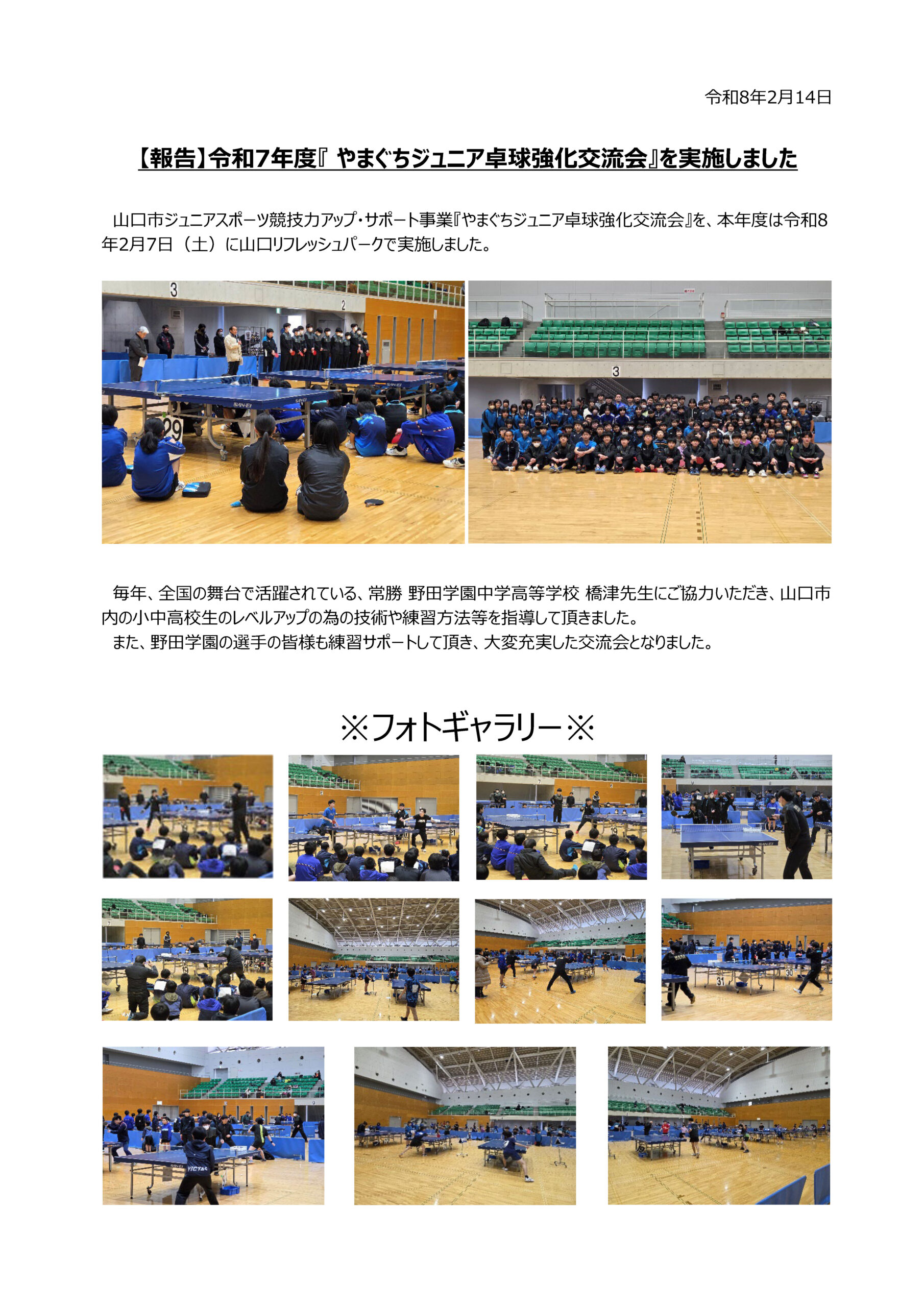 【報告】令和7年度『 やまぐちジュニア卓球強化交流会』を実施しました